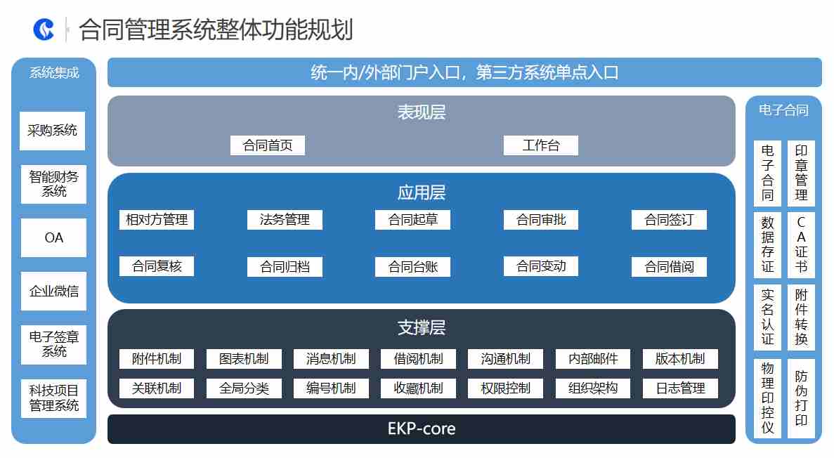■ 合同管理系統(tǒng)通過對OA系統(tǒng)和企業(yè)微信的集成,實現(xiàn)了內(nèi)部單點和移動端單點;