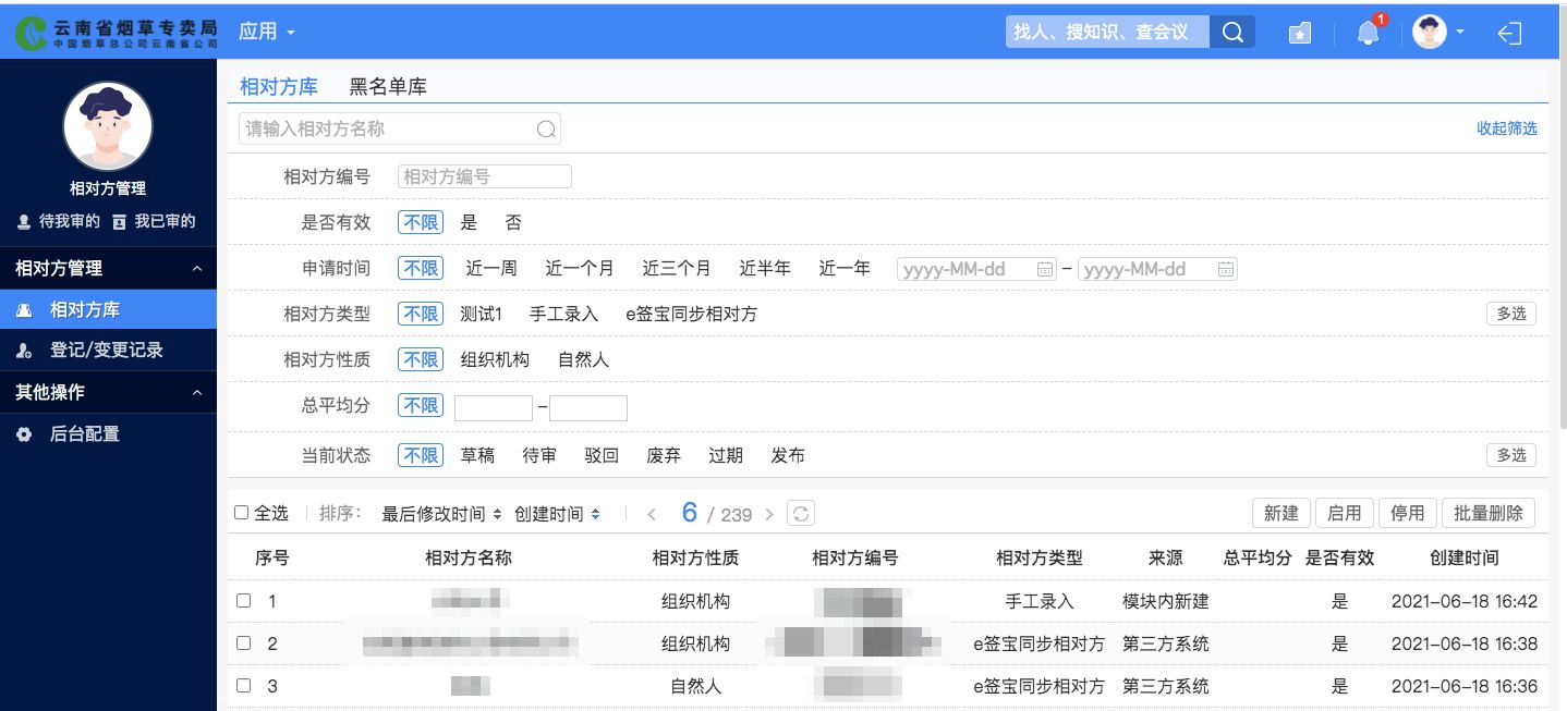 建立內(nèi)部統(tǒng)一相對方庫,依托大數(shù)據(jù)風(fēng)控技術(shù),動態(tài)防范相對方資信風(fēng)險。平臺支持證照資質(zhì)、賬戶信息、主要股東信息、資信評級信息等的管理。