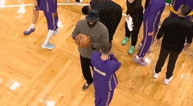 暫停期間詹姆斯身穿便裝在場(chǎng)內(nèi)拿著球摩拳擦掌躍躍欲試。