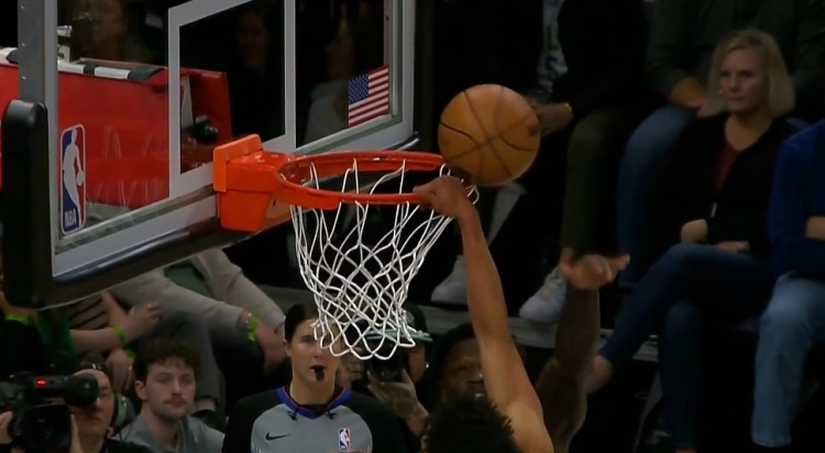 這不是干擾球?桑德斯單臂砸扣脫手 拽著筐球進(jìn)了!