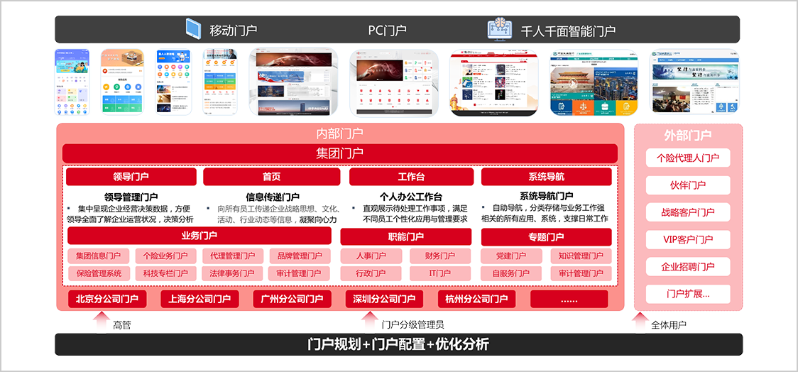 集團(tuán)、分公司、營業(yè)部等多組織多角色門戶建設(shè),實(shí)現(xiàn)不同層面辦公需求