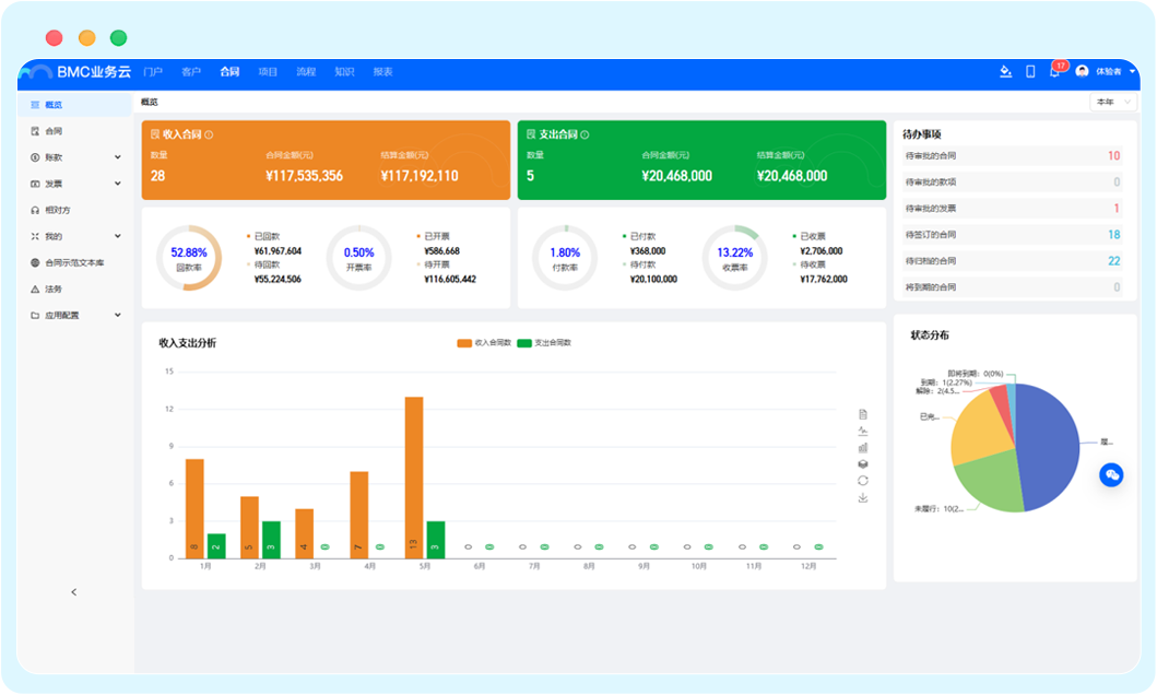 主營(yíng)送變電工程安裝。線下合同較多且雜,無(wú)法快速審核與款項(xiàng)及時(shí)跟進(jìn)。通過(guò)BMC-合同在線,實(shí)現(xiàn)了起草、審批、簽訂、歸檔、履行、賬款、發(fā)票、相對(duì)方與統(tǒng)計(jì)分析全在線。