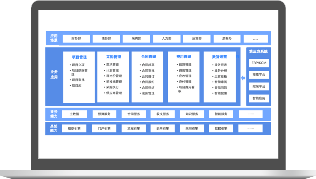 項(xiàng)目、采購(gòu)、合同、報(bào)賬等業(yè)財(cái)一體化融合,拉通權(quán)限業(yè)務(wù)協(xié)同更流暢,智能報(bào)銷、合同起草、合同審批、法務(wù)管理等環(huán)節(jié),并支持形成數(shù)據(jù)可視化報(bào)表