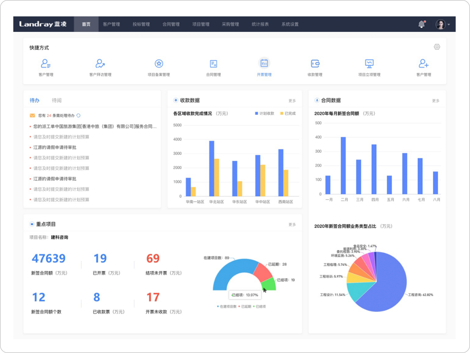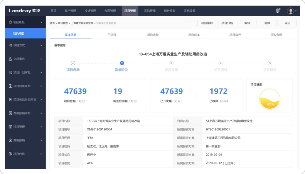 通過構(gòu)建招標(biāo)、合同簽訂、項目開展、項目收款、項目結(jié)項的一站式管理,實現(xiàn)項目業(yè)、財一體化管理,提升管理精細(xì)化,支撐企業(yè)全國不斷拓展市場邊界和業(yè)務(wù)領(lǐng)域。