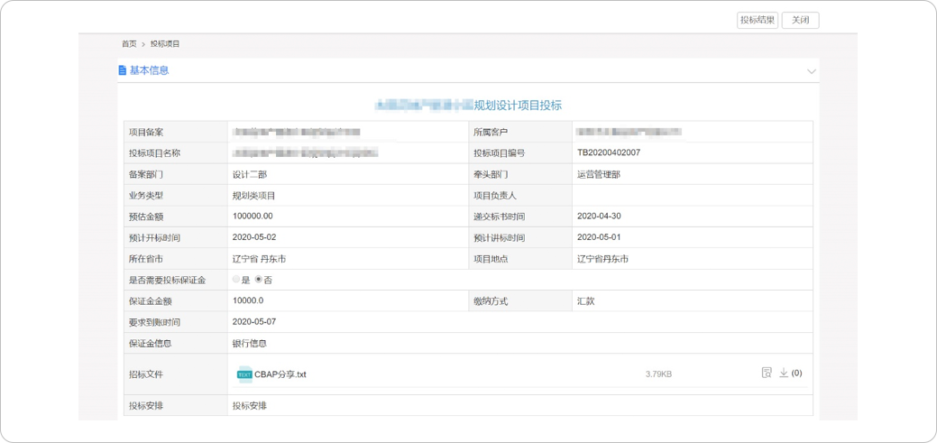 BMP投標(biāo)管理模塊為銷售人員進(jìn)行項目的投標(biāo)工作提供一個操作的平臺,主要包括投標(biāo)項目登記、審批、投后分析等,在線協(xié)作讓投標(biāo)工作更及時、更高效,促進(jìn)項目中標(biāo)。