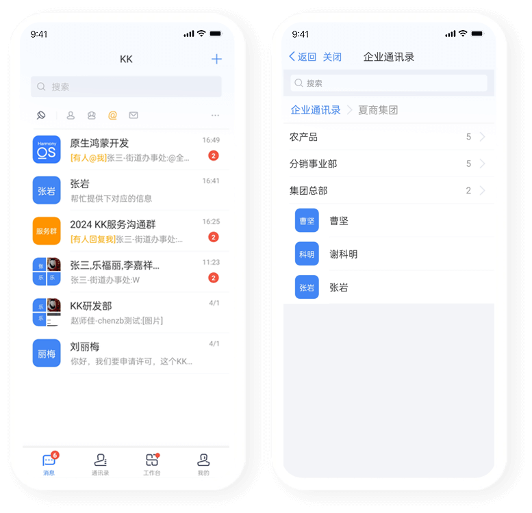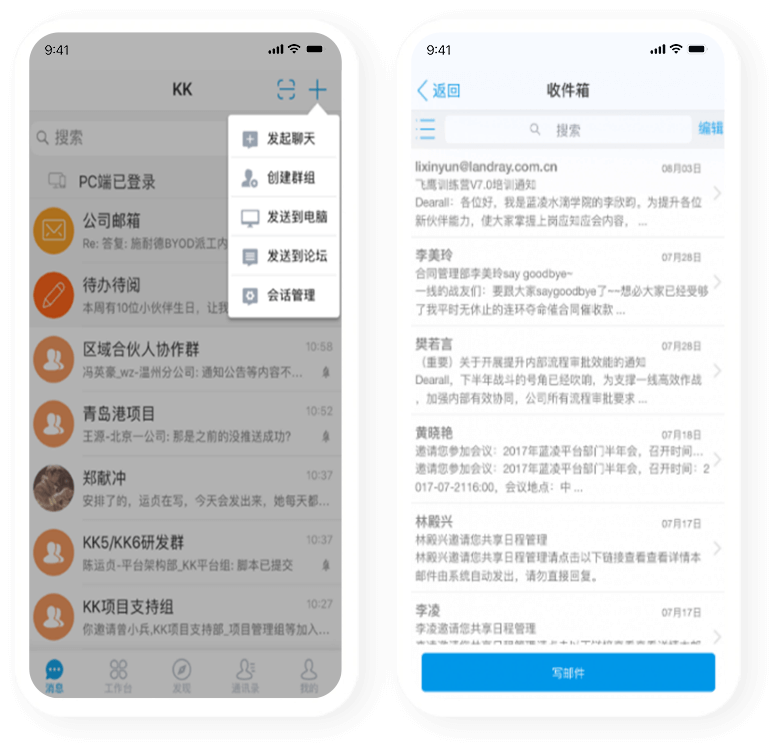 藍凌KK支持P2P、群聊、廣播;可通過應用通知和公眾號消息觸達用戶;支持員工調動自動退群;水印/防截圖,保障信息安全;已讀/未讀等功能讓溝通更高效。