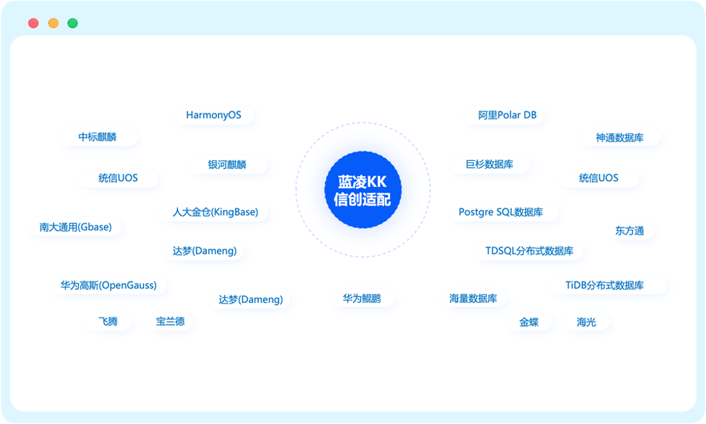 藍凌KK支持在主流國產(chǎn)操作系統(tǒng)(中標麒麟、銀河麒麟、統(tǒng)信UOS、HarmonyOS…)、國產(chǎn)CPU、國產(chǎn)數(shù)據(jù)庫等上面運行,打造更安全高效信創(chuàng)辦公。