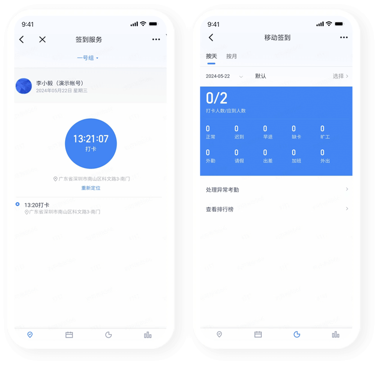 支持異地打卡、智能提醒,方便外勤人員;考勤異常,在線流程快處理,考勤自動算工時、匯總數(shù)據(jù),更方便。