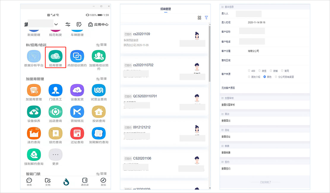 支持意向客戶通過微信公眾號\釘釘自助申請加盟,區(qū)域招商經(jīng)理在線審核加盟商條件,支持首簽、遷址續(xù)約、開分店等多種簽約類型,在線填寫合同基本信息。在簽約結(jié)束前,IT分配加盟商賬號,自動觸發(fā)門店信息采集等相關(guān)流程。