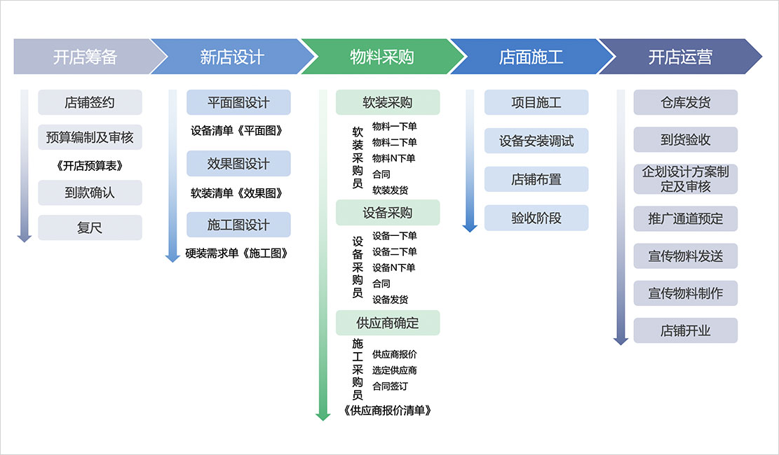 從開店籌備、新店設(shè)計、物料采購到店面施工、開店運營,每個環(huán)節(jié)都有標準化流程支撐,確保新店開業(yè)統(tǒng)一操作。支持出圖簽約、營建下單、裝修進度、門店驗收等流程化管理,確保全程可控,高效開店。