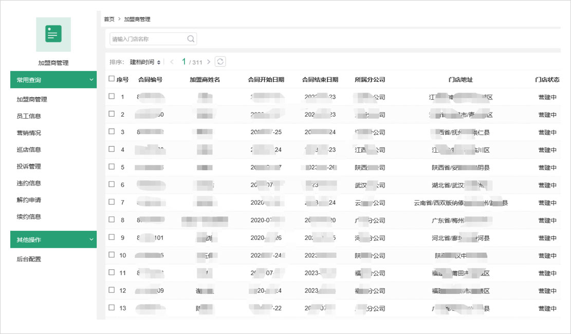 集中門店運營人員、簽約人和門店違約、遷址、續(xù)約等信息,方便營運總監(jiān)查看區(qū)域門店、營運負責人管理店鋪、加盟商維護店內(nèi)設(shè)備發(fā)貨等信息。支持門店常用流程管理;及時生成每日、月度銷售排名、門店明細等報表。