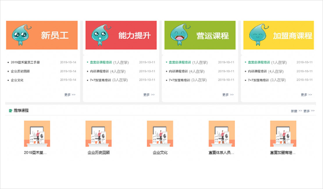 構(gòu)建線上線下一體化學習平臺,支持內(nèi)部員工及加盟商的培訓;內(nèi)訓人員的學習情況及考核結(jié)果可自動寫到人事檔案中;外訓人員學習情況及考核結(jié)果可自動寫到加盟商員工管理中。