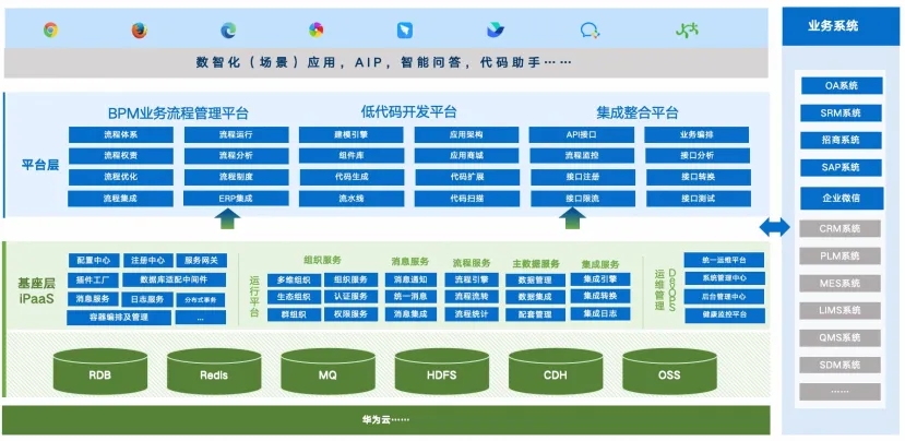 基于新的BPM流程中臺,實現(xiàn)與金碟EHR組織架構(gòu)同步,接入企微信,并集成SRM、招商等業(yè)務(wù)流程,賦能核心業(yè)務(wù)核心業(yè)務(wù)執(zhí)行更高效,數(shù)據(jù)互通,管理更智慧。