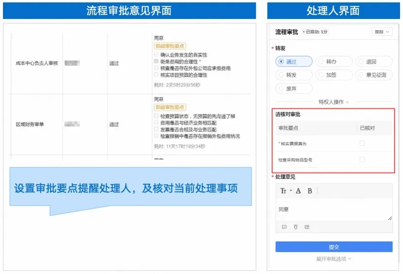 針對流程處理人需核對單據(jù)中內(nèi)容較多,容易出現(xiàn)遺漏的情況,將審批要點融入流程中,必須勾選確認,方可通過流程,進而減少審批過程出錯幾率。