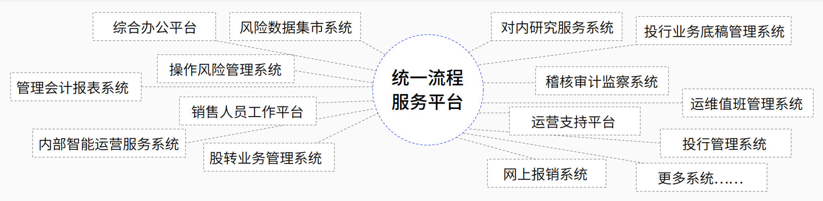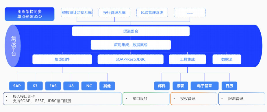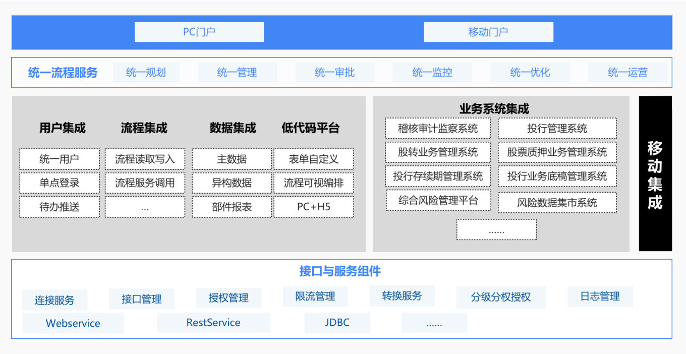 集成綜合辦公、投行管理、對內(nèi)研究服務(wù)、綜合風險管理、運營支持等30+套系統(tǒng),讓業(yè)務(wù)協(xié)同更高效。為下游系統(tǒng)提供完整的流程建模以及流程執(zhí)行的開放能力。
