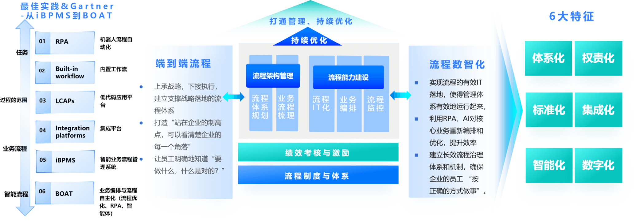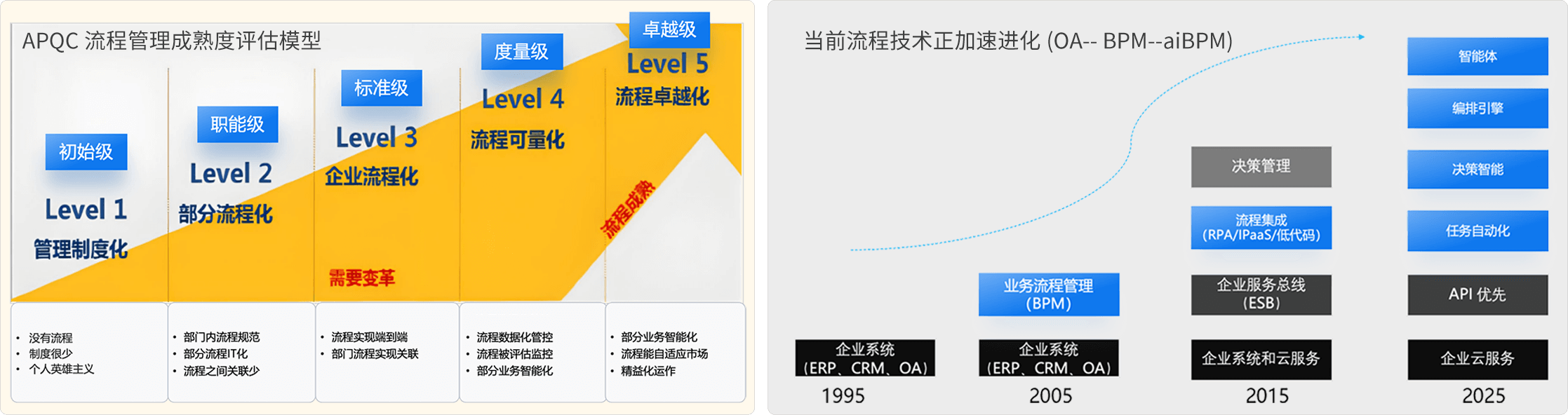 在關(guān)稅貿(mào)易、中國制造4.0、燈塔工廠、全球化等背景下,企業(yè)如何快速響應(yīng)業(yè)務(wù)持續(xù)變革?流程管理及數(shù)智化至關(guān)重要。一方面,中國企業(yè)流程成熟度大多處于低位水平(APQC Level2-3之間), 呈現(xiàn)流程碎片化、業(yè)務(wù)斷點(diǎn)多、職責(zé)混亂、流程管理粗放、運(yùn)維成本高、組織低效等狀況;一方面,當(dāng)前流程管理信息技術(shù)正加速向“BOAT”(Gartner,Business Orchestration and Automation Technologies業(yè)務(wù)編排和智能體技術(shù))進(jìn)化。企業(yè)流程變革,將迎來新一輪管理與技術(shù)的AI數(shù)智化升級。
