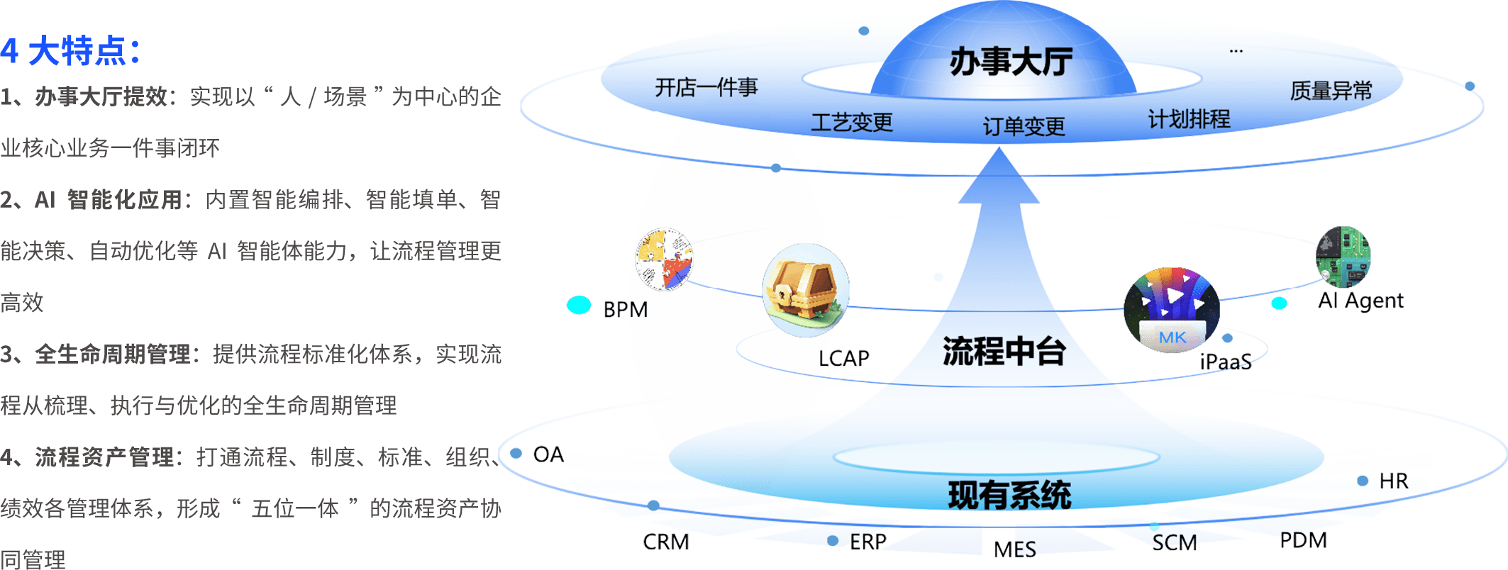 藍(lán)凌全新aiBPM基于“Gartner BOAT”(業(yè)務(wù)編排和智能體技術(shù))理念,融合AI-Agent(智能體)、BPM(業(yè)務(wù)流程自動(dòng)化)、iPaaS(集成平臺(tái)即服務(wù))、LCAP(低代碼)等技術(shù), 支持企業(yè)以業(yè)務(wù)優(yōu)化、變革和重組為核心,以人/場景為中心(一件事)的流程自主驅(qū)動(dòng),實(shí)現(xiàn)企業(yè)核心高頻業(yè)務(wù)的流程效率提升。
