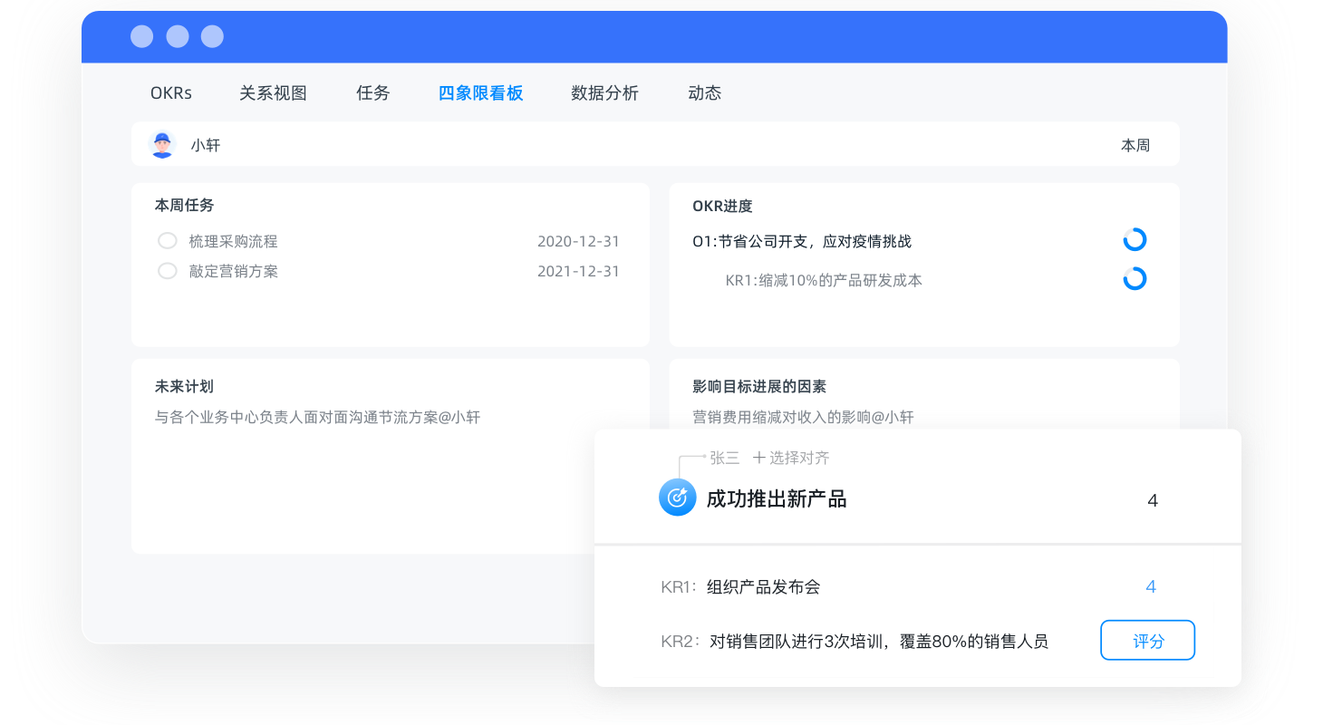 每周的復(fù)盤都能及時對任務(wù)和KR完成情況進(jìn)行全局式概覽,大大提升了團(tuán)隊(duì)的戰(zhàn)斗力。