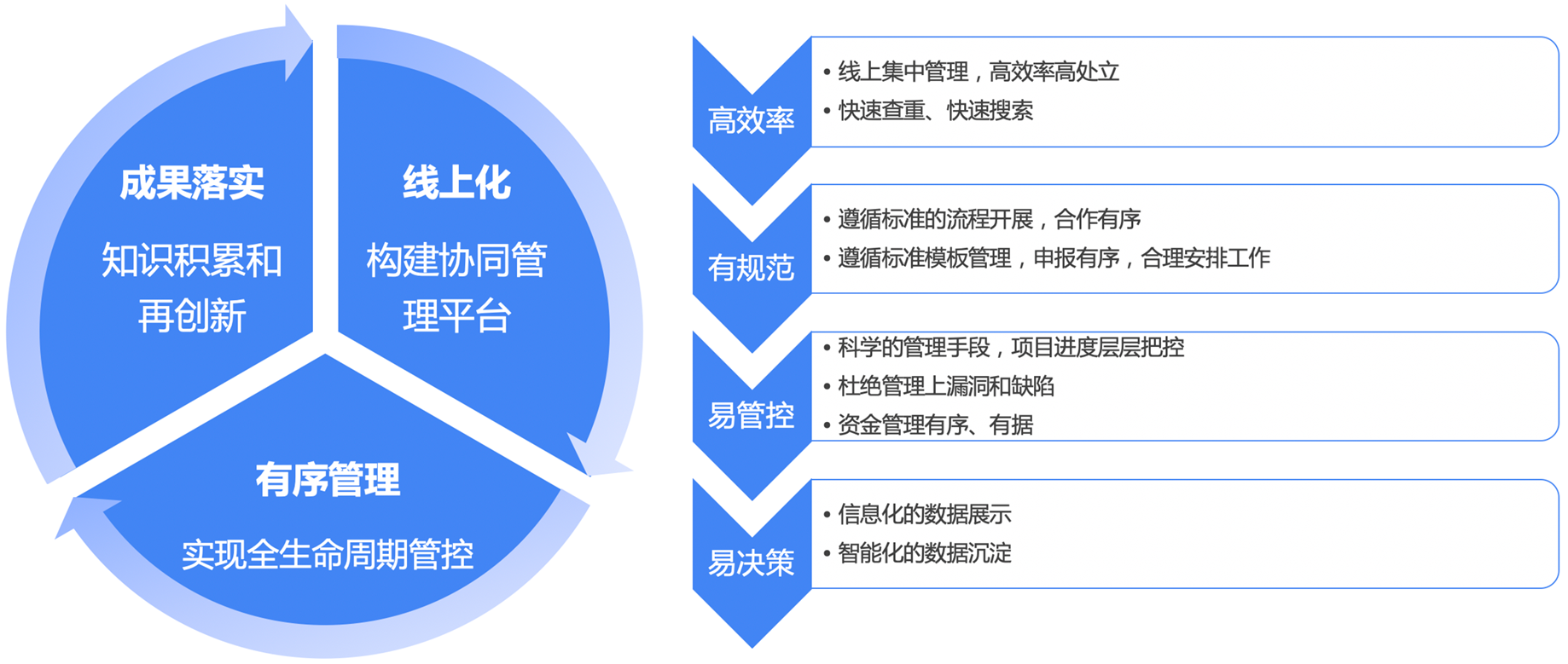 通過網(wǎng)上申報(bào)、審核、審批、業(yè)務(wù)協(xié)同推動(dòng)研發(fā)項(xiàng)目全程動(dòng)態(tài)跟蹤和管理,實(shí)現(xiàn)科研項(xiàng)目“人才、資金、事務(wù)、成果”全生命周期管理,保障項(xiàng)目執(zhí)行