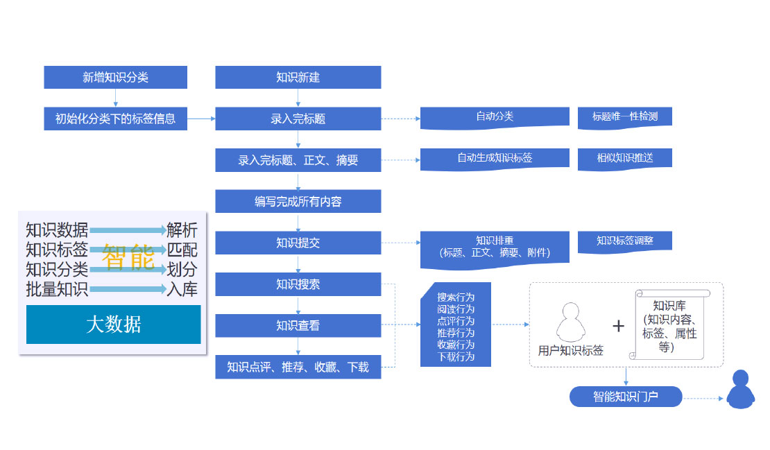 提供基于知識(shí)倉庫和原子知識(shí)的知識(shí)數(shù)據(jù)進(jìn)行自動(dòng)精準(zhǔn)匹配知識(shí)分類和標(biāo)簽的功能,實(shí)現(xiàn)知識(shí)入庫智能分類、智能標(biāo)簽、知識(shí)排重、批量入庫、智能推薦