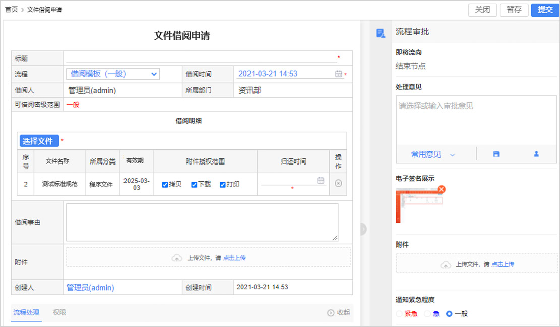 文件發(fā)布后,有借閱權(quán)限的人員可以進(jìn)行文件借閱,從文件借閱、審批到歸還全流程在線管理