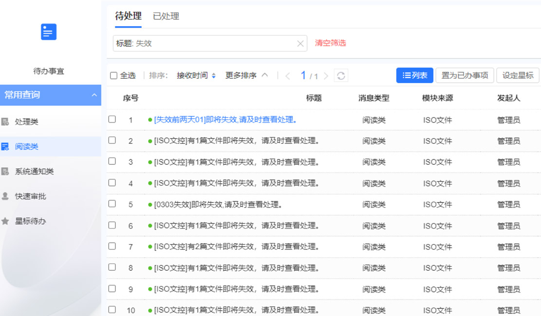 可針對臨期文件設(shè)定提醒,當(dāng)?shù)竭_(dá)失效提醒時(shí)間時(shí),系統(tǒng)自動以待閱通知、郵件、短信等形式發(fā)送指定對象,便于相關(guān)人員及時(shí)知悉文件臨期的情況