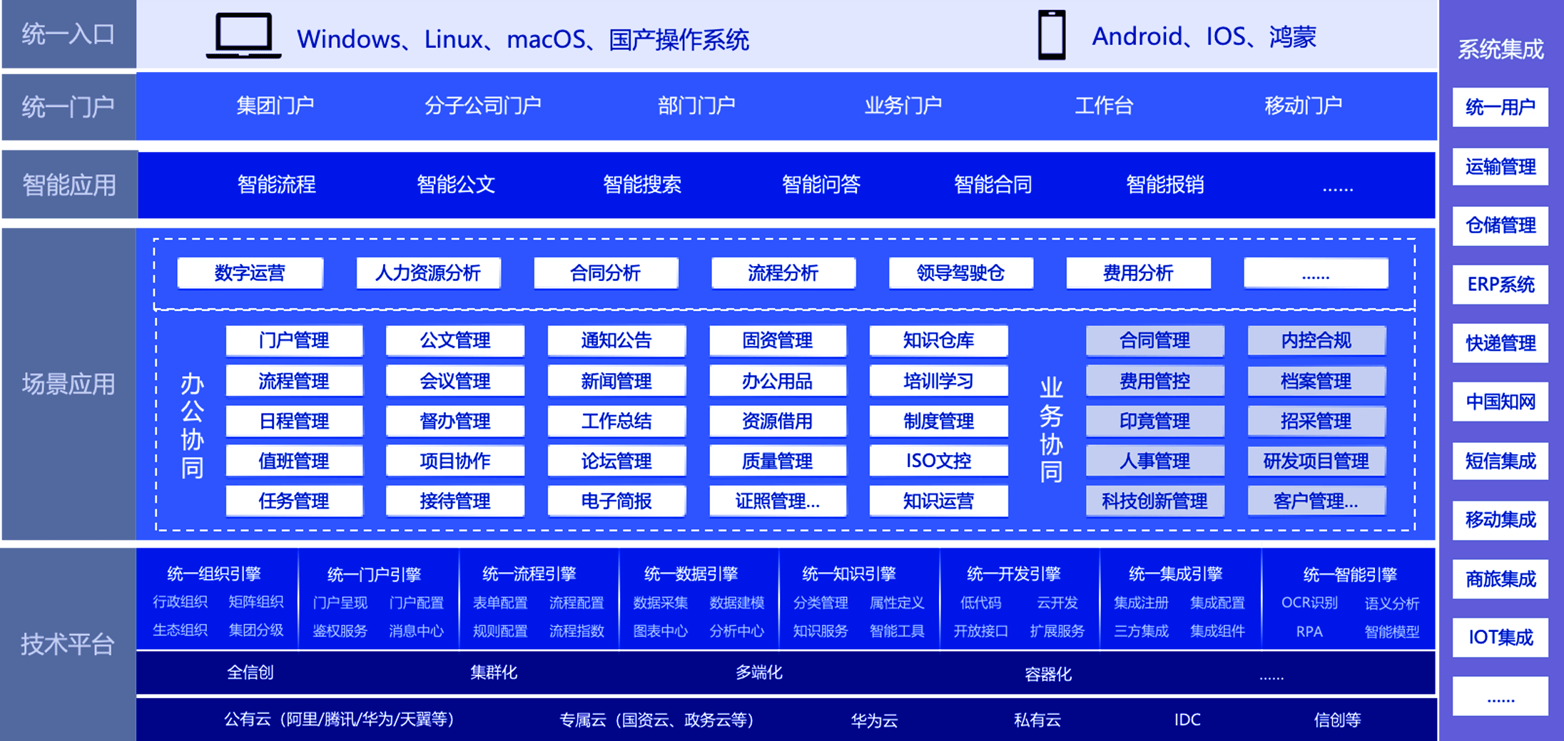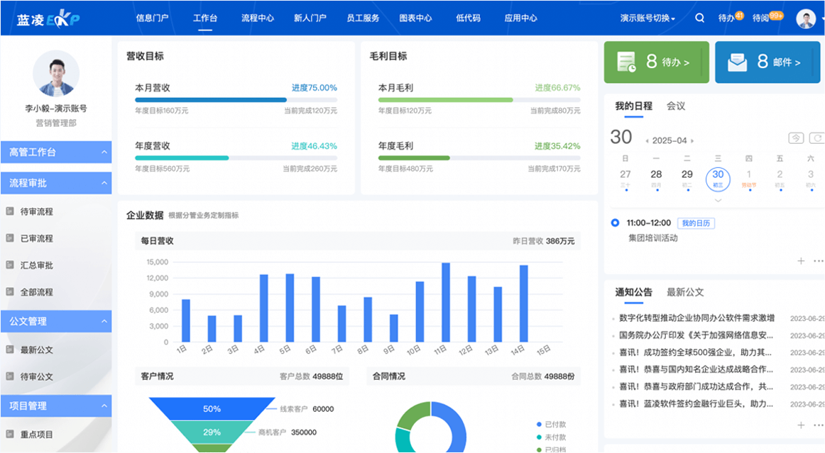 用藍凌平臺升級智慧辦公、合同等系統(tǒng),新平臺支持性能可伸縮、應(yīng)用可擴展、業(yè)務(wù)可集成;新OA滿足信創(chuàng)要求,提效組織協(xié)同與集團管控,智慧合同覆蓋合同擬稿、審批、簽訂、履約等全程管理。