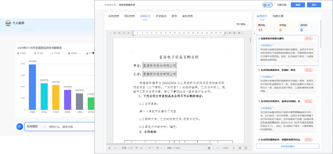 接入藍博士LanBots.AI,可支持合同智能抽取、條款生成&改寫、智能審查、智能比對、智能問數(shù)等,讓合同管理更高效、合規(guī)。