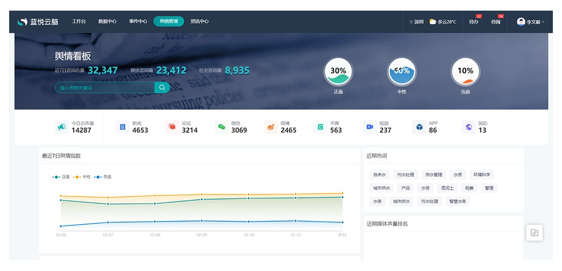 對互聯(lián)網(wǎng)資訊進行收集,并通過總量、媒體聲量、輿情指數(shù)、熱詞、熱點等維度進行分析展示,提供科學(xué)的輿情管理。