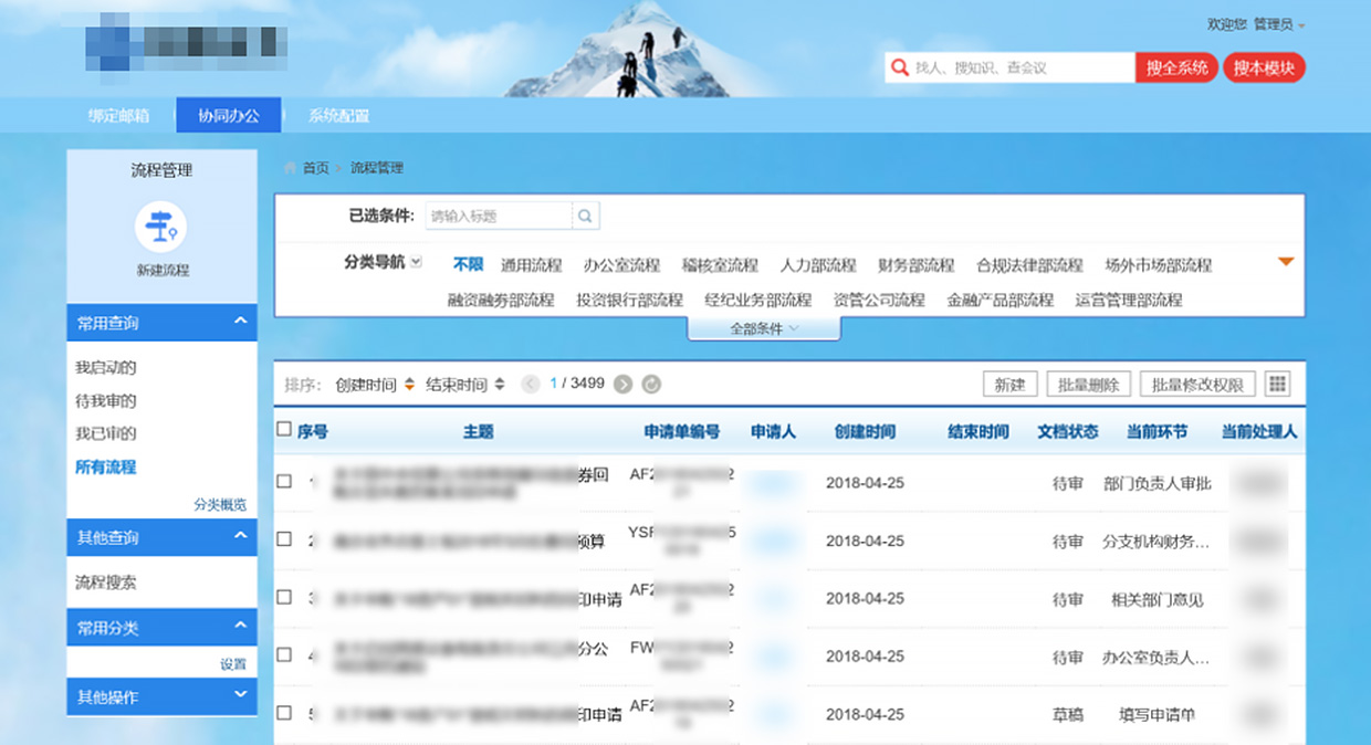 • 梳理優(yōu)化投行項目管理、證券產(chǎn)品管理、投行定價管理、稽核審計管理以及人事、財務、行政辦公等系列流程并進行E化落地,實現(xiàn)全業(yè)務流程申請、審批在線,提效流程流轉效率