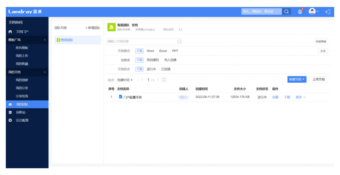 支持自主構(gòu)建團(tuán)隊,多人同時編輯文檔,便捷共享、快速檢索;支持跨部門、組織文檔協(xié)作,實現(xiàn)團(tuán)隊協(xié)作在線管理