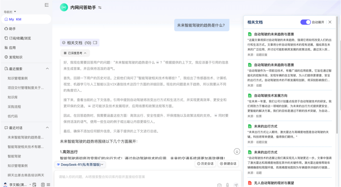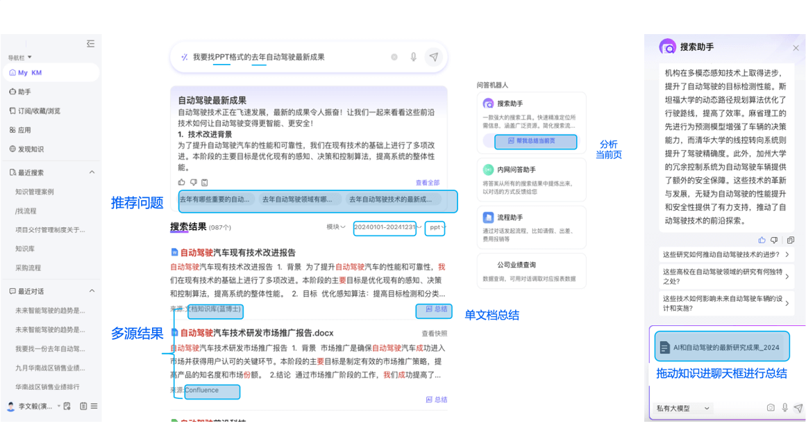 可支持語義搜索,可搜索到來自于OA等多個(gè)系統(tǒng)來源的知識(shí),支持對(duì)單文檔、當(dāng)前所有搜索結(jié)果進(jìn)行總結(jié),快速、精準(zhǔn)獲取所需知識(shí)