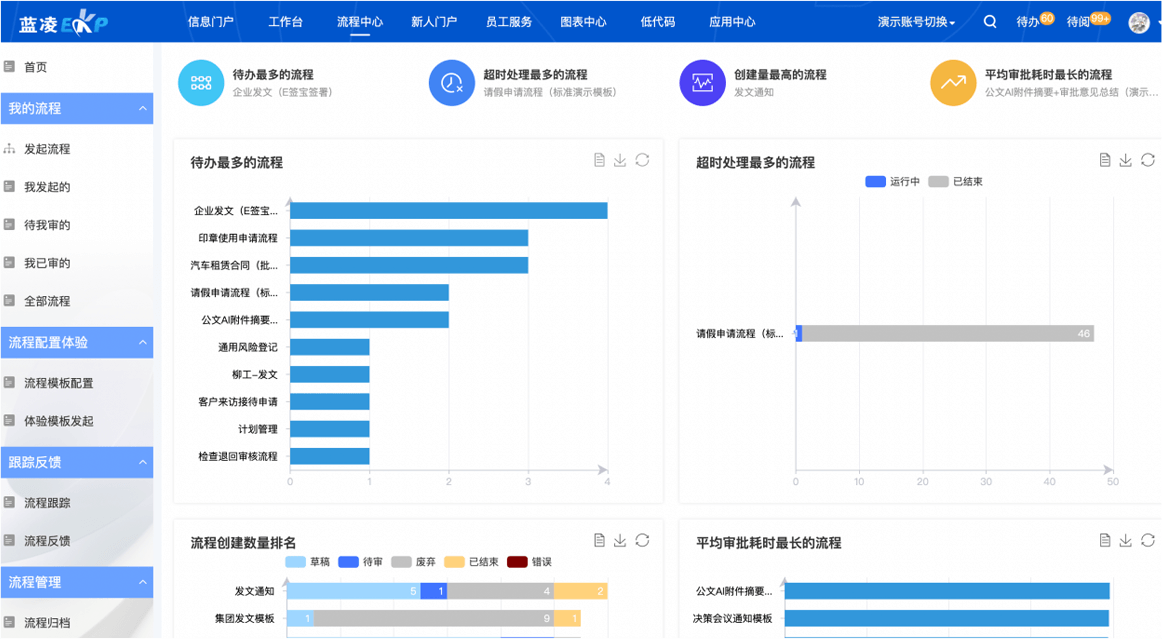 支持對(duì)流程運(yùn)行質(zhì)量、人員辦件效率、部門辦件效率等進(jìn)行分析,助力運(yùn)營(yíng)持續(xù)優(yōu)化